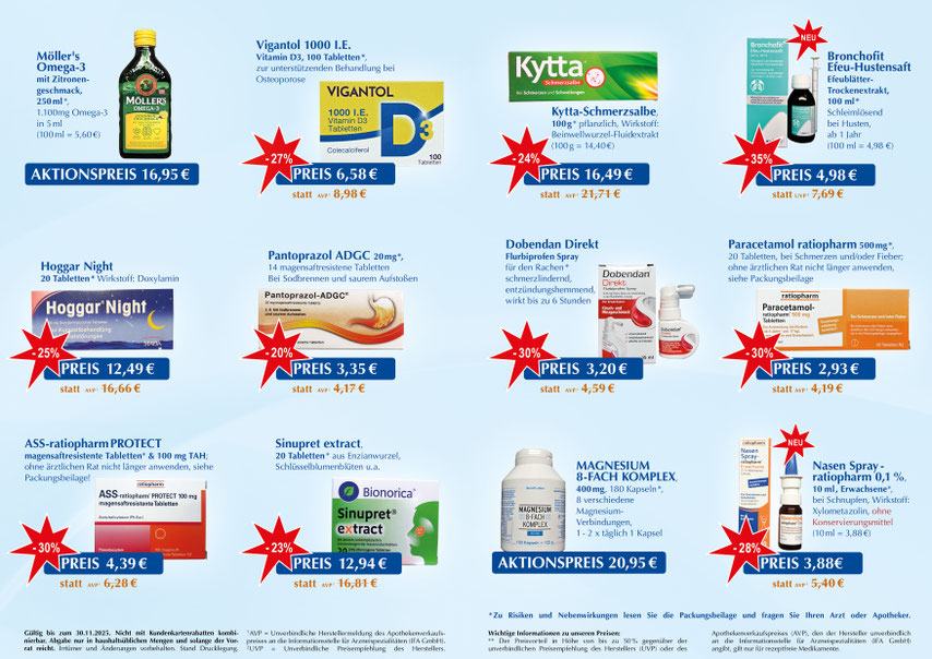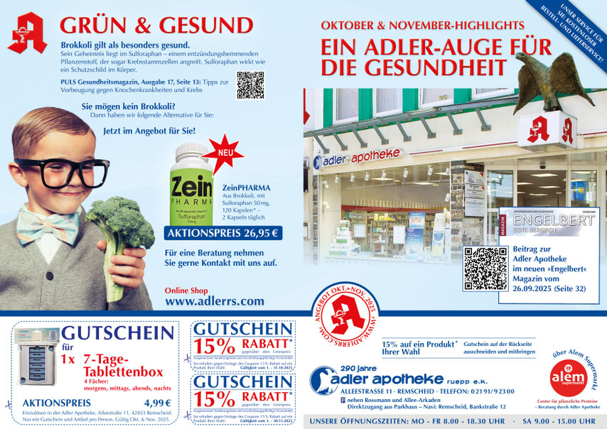 Die aktuellen Monatsangebote für Oktober und November 2025 der Adler Apotheke Ruepp in Remscheid als PDF zum Herunterladen